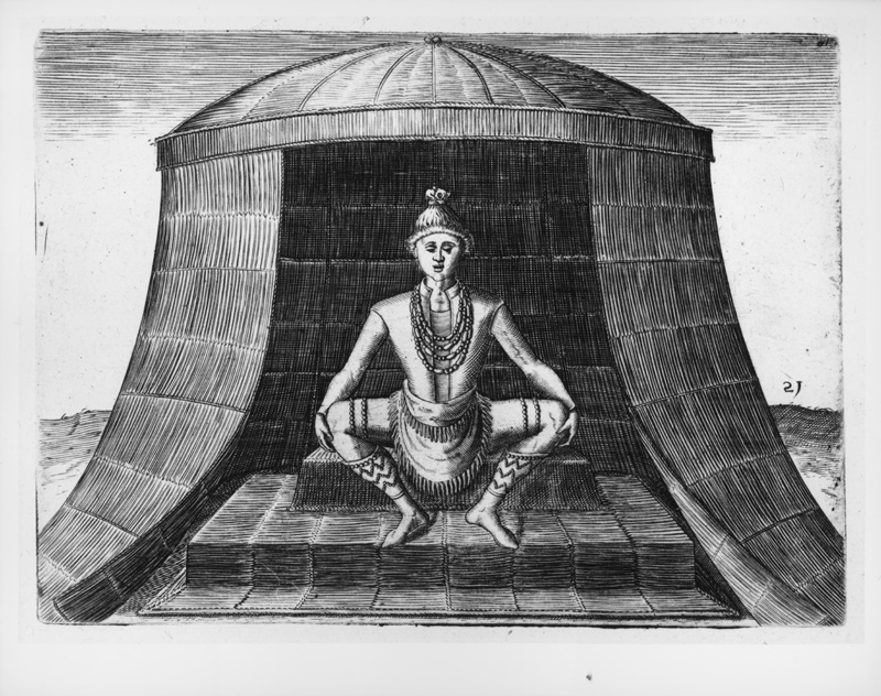 The image above was originally painted by John White during the 2nd English voyage to America in 1585 and reporduced in an engraving by Theodor De Bry in 1590. Thomas Herriot reported that this image Kewas" was found in "homes or … temples." The word "Kewas" in Lenape means "Mother." A "Mother" in a temple is reminiscent of "Blessed Virgin Mary; Mother of Jesus." The Catholics in France had the Virgin Mary in every church. The Catholics in America may have had the "Mother of Jesus" in every temple.