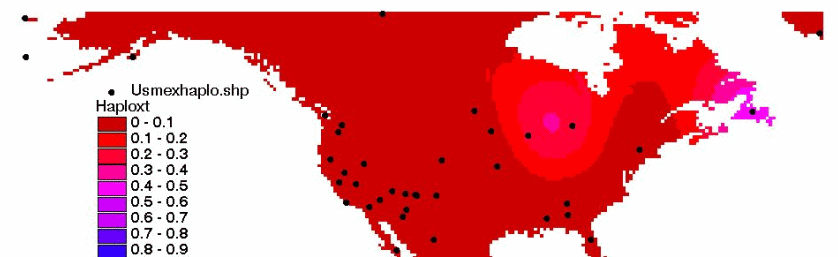 Comment: The people of hapolgroup X appear to have entered America via Newfoundland and the Hudson Bay. This migration is consistant with the historical movements of the Albans followed by the Norse people who walked the ice from Greenland to get to James Bay. The low perceentage of the haplogroup X indicates that the migration was also an intermixing of peoples and cultures.