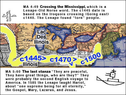 The wording of MA 4:17, which is about ten dead men, appears to be duplicate recording of the episode punched into the Kensington Rune Stone, which is now on display in a museum in Alexandria MN. The killing of ten men at once might have been a shocking episode for the Lenape. Their ethics may have included the Ten Commandments, which includes “Do not kill [humans].” The episode yields a firm calendar date, 1362, for the MA 4:17 stanza.